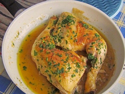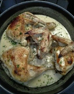 Ho provato la ricetta di recente e sono assolutamente entusiasta. Le molte spicchi d'aglio non mi hanno spaventato, perché amo l'aglio comunque. Tuttavia, ho cambiato un po' la ricetta. Ho usato il doppio della quantità di vino e meno acqua per questo. Aggiunto alcune gocce di succo di limone alla salsa verso la fine, che ha dato l'ultimo tocco (Tuttavia, non dovresti farlo se usi un vino che ha molta acidità). A parte questo, non cambierei nulla della ricetta, poiché mi impressiona per la sua semplicità.